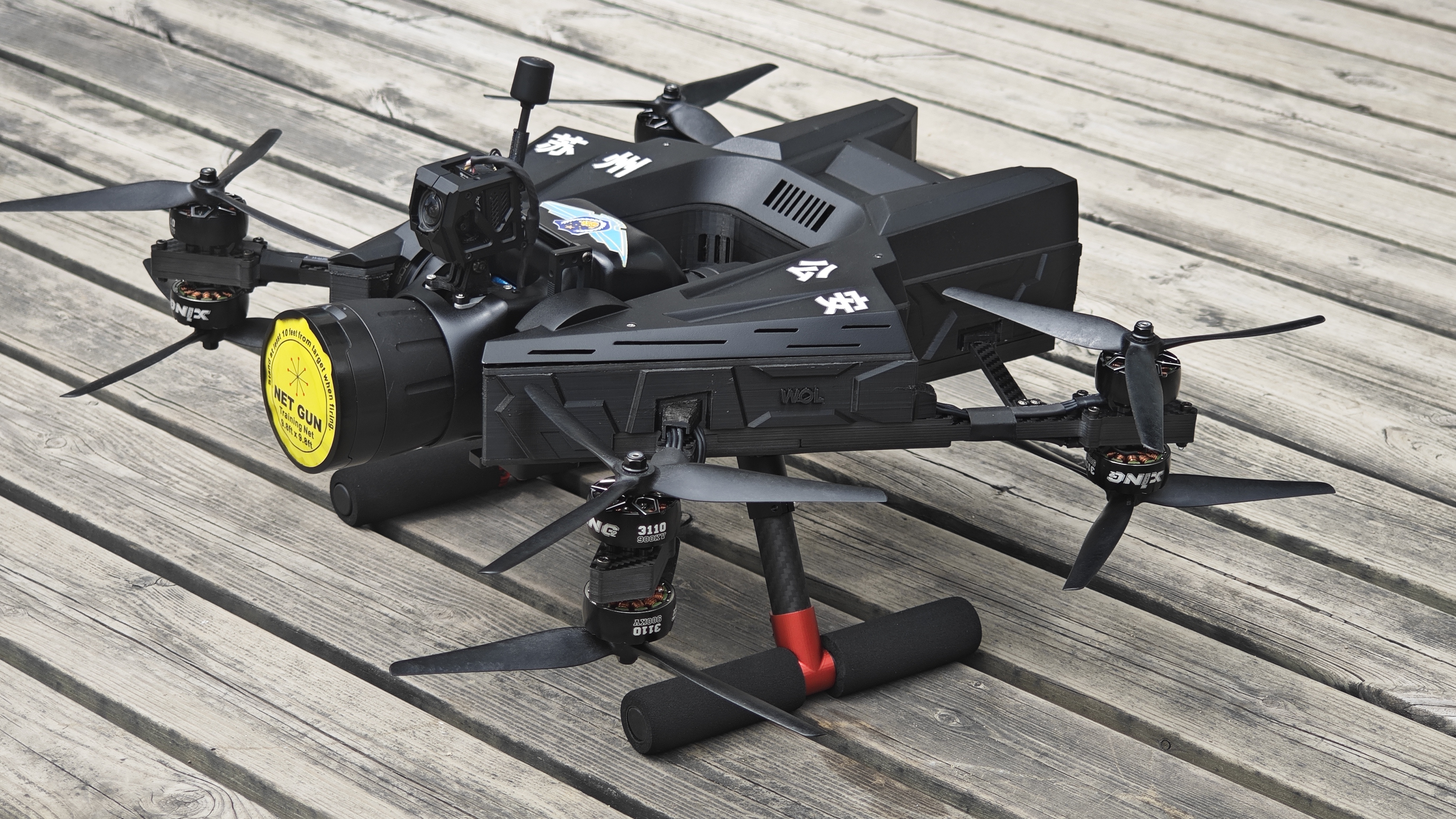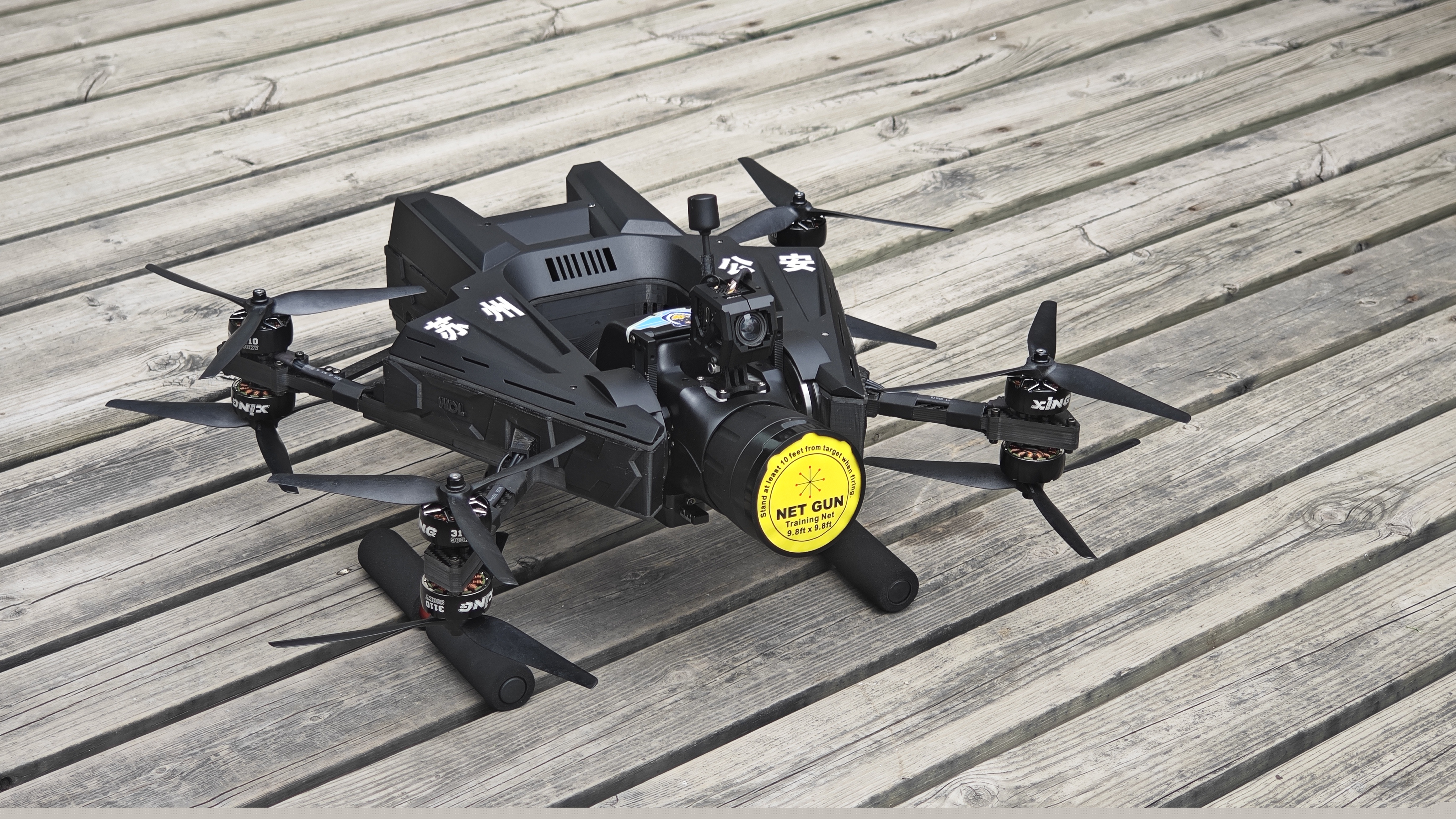 “獵鷹-465”網(wǎng)聯(lián)特種無人機采用“U”字型設(shè)計,將搭載單軸攝像頭的網(wǎng)槍置于“U”型之中,實現(xiàn)網(wǎng)槍俯仰角度的自由變化,同時搭載單軸自穩(wěn)云臺,在穿越機基礎(chǔ)上改變飛行模式,不管無人機載機飛行角度如何,飛得快或慢,單軸網(wǎng)槍與攝像頭始終自穩(wěn)保持一個固定的角度,除此之外飛手還可以通過飛行遙控器或體感遙控器控制單軸網(wǎng)槍的角度變化,當(dāng)飛手無操作動作時無人機保持懸停,取航拍無人機的穩(wěn)定和穿越機的強勁動力的優(yōu)點。大大的提高了飛手在懸停或飛行瞄準時無人機位置的隨意性,同時對飛手的操作要求也同步大大降低。